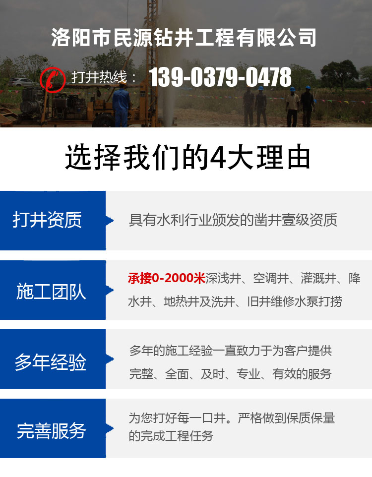 洛陽市民源鉆井工程有限公司是技術(shù)過硬、經(jīng)驗豐富的施工團隊,具有鑿井行業(yè)壹級資質(zhì)證書,擁有水鉆400、300鉆機、空壓機、打樁機、潛孔錘十余臺;適用于農(nóng)家打井、農(nóng)田打井、機關(guān)單位打井、企業(yè)廠家打井、以及各種工程工地打井。